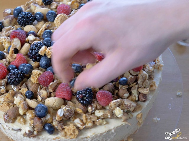 Die Amerettini könnt Ihr grob zerbröseln, zu den Nüssen geben und dann gemeinsam auf der Torte verteilen. Auch die verschiedenen Beeren könnt Ihr auf der Torte drapieren und wenn mal etwas runterfällt, ist es gar nicht schlimm. Die Torte mag es in jedem Fall auch rustikal.